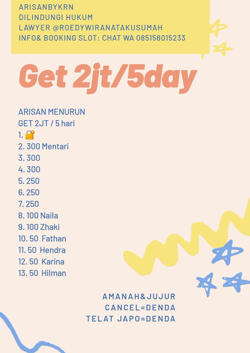 Arisan receh get 500r, 2juta, 4 juta ,10juta. Arisan menurun kloter 4 get 750 ribu / 10 hari free admin. Untuk yang dapat pertama kali kalaudinominalkan jumlah uang yang harus dibayar selama ikut arisan online adalah2,8 jt. Arisan menurun adalah sebagai berikut: Syaratnya, member itu membayar iuran lebih besar dibanding member lainnya. Kemudian arisan rp 5 juta sudah bayar dua kali. Dia mengambil nomor terakhir sudah bayar rp 500.000 tetapi arisannya dihapus oleh owner. Atau dm admin 🤲 cari yg amanah. Sebaliknya untuk yang nomor terakhir ,nominal yang dibayar cuma 1,6 juta.artinya yang terakhir ini mendapatkankeuntungan 300rb, karena 100rb dipotong biaya admin. Nah kalau arisan menurun, mereka yang dapat pertama akan membayar semisal rp 1,3 setiap bulannya sampai. Alasan objektif, sering dijumpai di masyarakat berbagai macam sistem arisan. Arisan menurun get 2 juta / 7 hari admin : Arisan menurun get 1 juta/minggu 25 orang pembayaran receh minat chat.